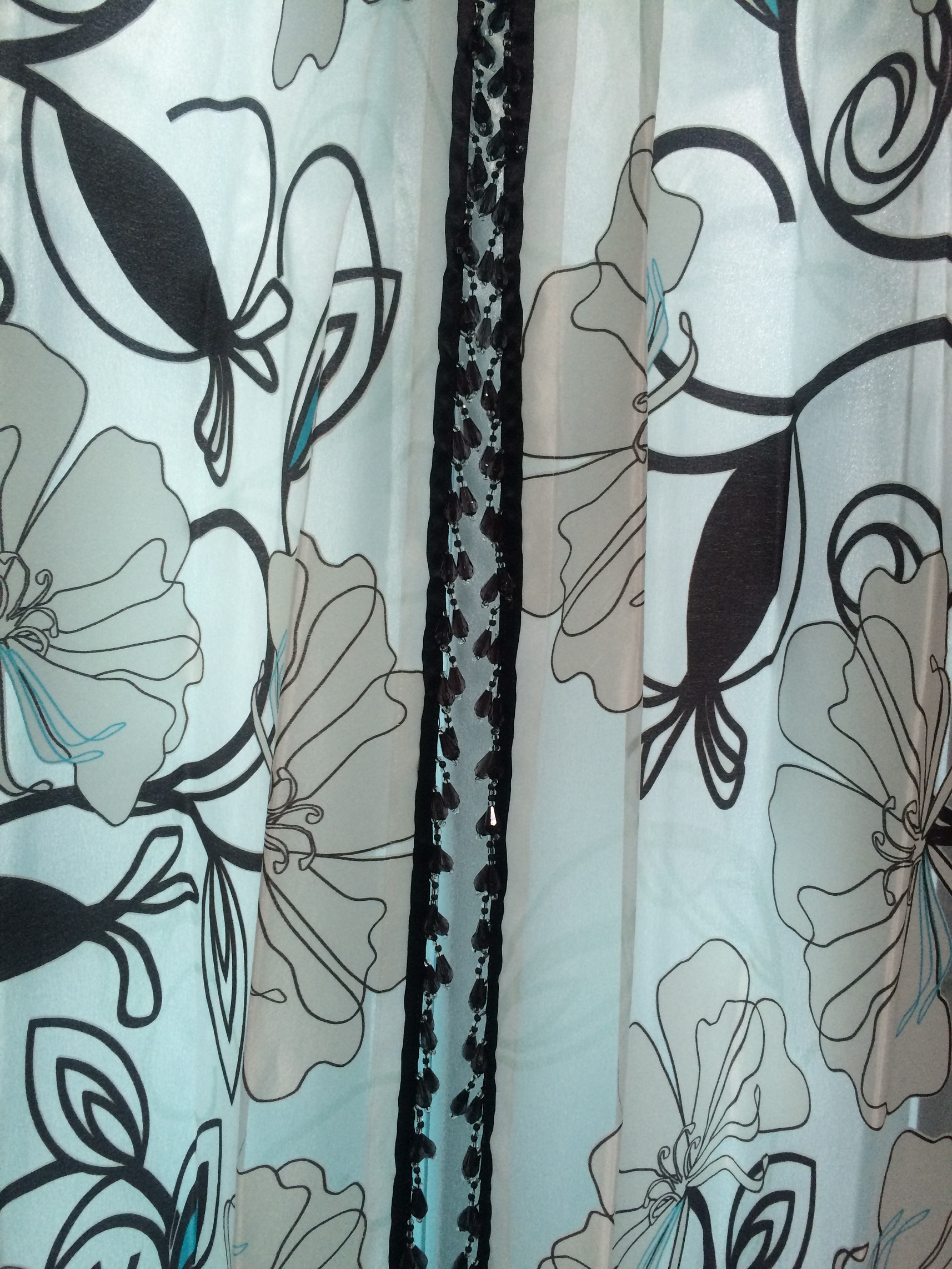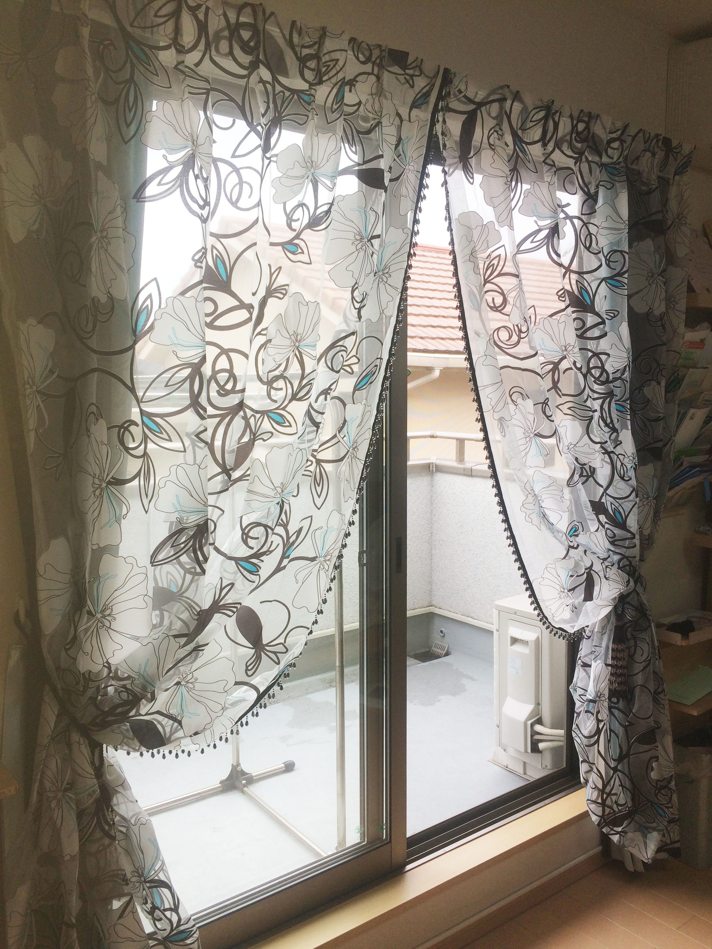 カフェカーテンの裾にもビーズをつけて涼しげな雰囲気に